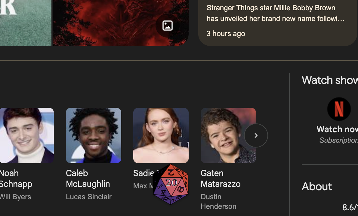 This theory also seems to be confirmed by Google, because when you look up Stranger Things, you get this DnD dice at the bottom of your screen, which is stuck on the number 20.