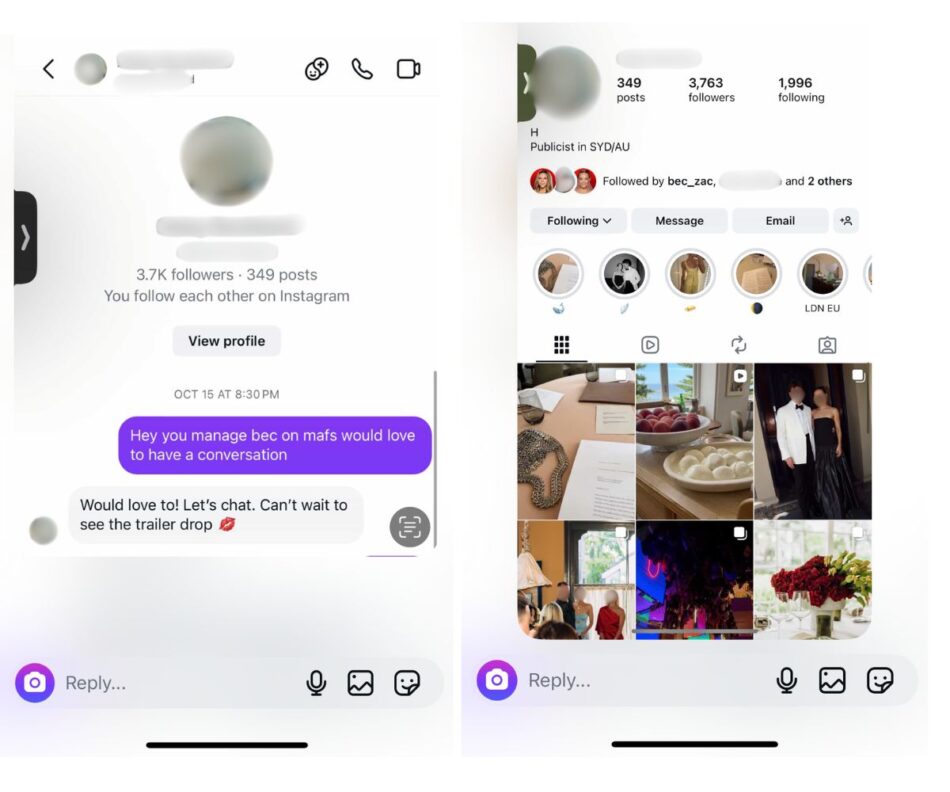 “Filming ran until the end of November, so filming was still taking place when Bec was working with the publicist,” they added. Chattr has seen screenshots further to the ones below that align with the insider’s claims.