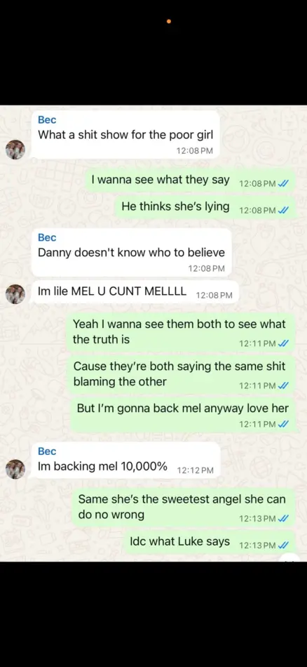 Sadly, we don’t have the conversation in full: we only have what Gia reportedly screen grabbed and tucked away as “receipts”. The first screenshot shows an exchange between Bec, Gia, and former participant Brook. Since Gia allegedly took the screenshots from her phone, her messages are probably the ones in green.