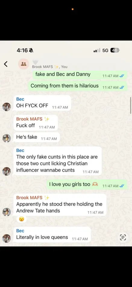 So without further ado, feast your eyes on this first exchange, where Alissa and David (presumably, being the Christian ones) are allegedly referred to as “fake c**ts” and, to drive the point home, “two c**t-licking Christian influencer wannabe c**ts.”